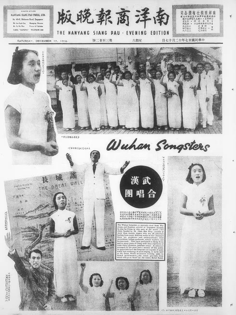 武汉合唱团团员合影。曾琼琼轻抚照片说,“他们很年轻,就是20多岁,我母亲当时当老师,把自己工作辞掉了,就去了。”武汉合唱团团长夏之秋侄孙女徐力文告诉记者,其中最小的团员是18岁,叫江心美。他们用这种文化的方式来作为武器,来参加抗战。在时任中共长江局负责人董必武的帮助下,1938年9月,武汉合唱团一行28人从武汉启程,途经广州、澳门、香港,于12月抵达新加坡。在爱国侨领陈嘉庚的支持下,12月18日晚,武汉合唱团在新加坡大世界游艺场进行首场试演。