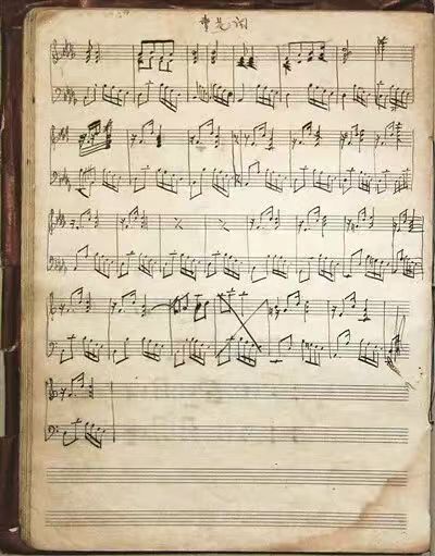 《卖花词》乐谱。曾琼琼说:“华侨非常爱国,不愿意这一段被遗忘,后来就是有当地的华侨出的书,就是讲这个‘武汉合唱团’。”